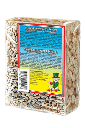 Ingredients: Corn chips 31.25% (corn grits, water, salt), roasted sunflower kernels 28%, toffee mass (sugar, glucose syrup, WHEY powder (10%), BUTTER (5%), vegetable fat (palm), salt, flavorings), glucose syrups, water. May contain traces of ALMONDS, HAZELNUTS, CASHEW NUTS, PISTACHIOTS, PEANUTS, SESAME, GLUTEN, MILK (including LACTOSE), EGGS and their products.