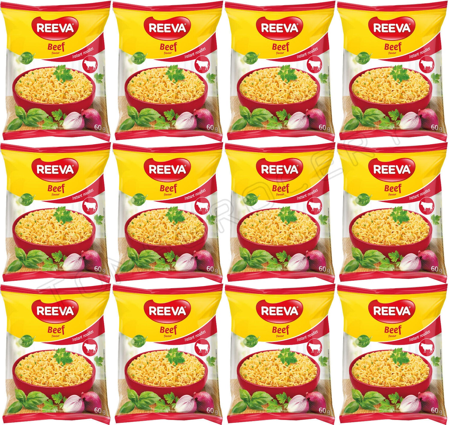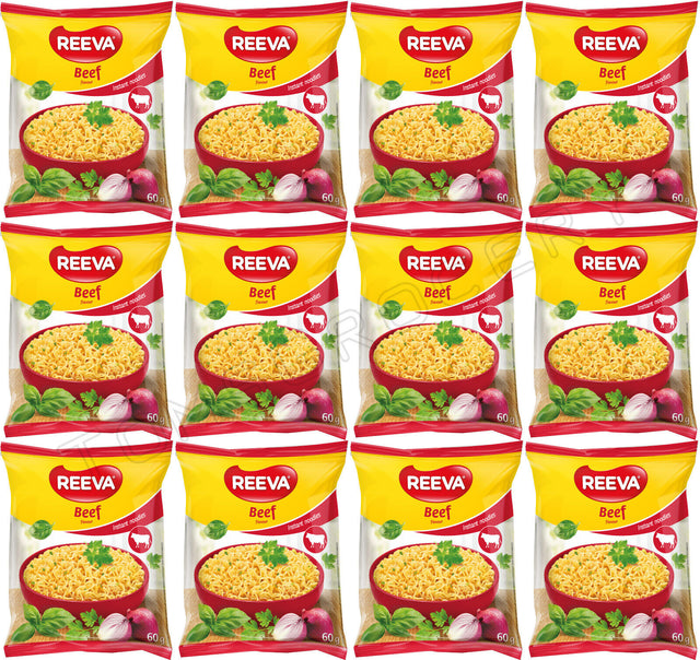 12 REEVA BEEF Flavor Instant Ramen Noodle Soup Snacks (Rollton) 60g 2.2oz
