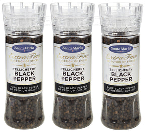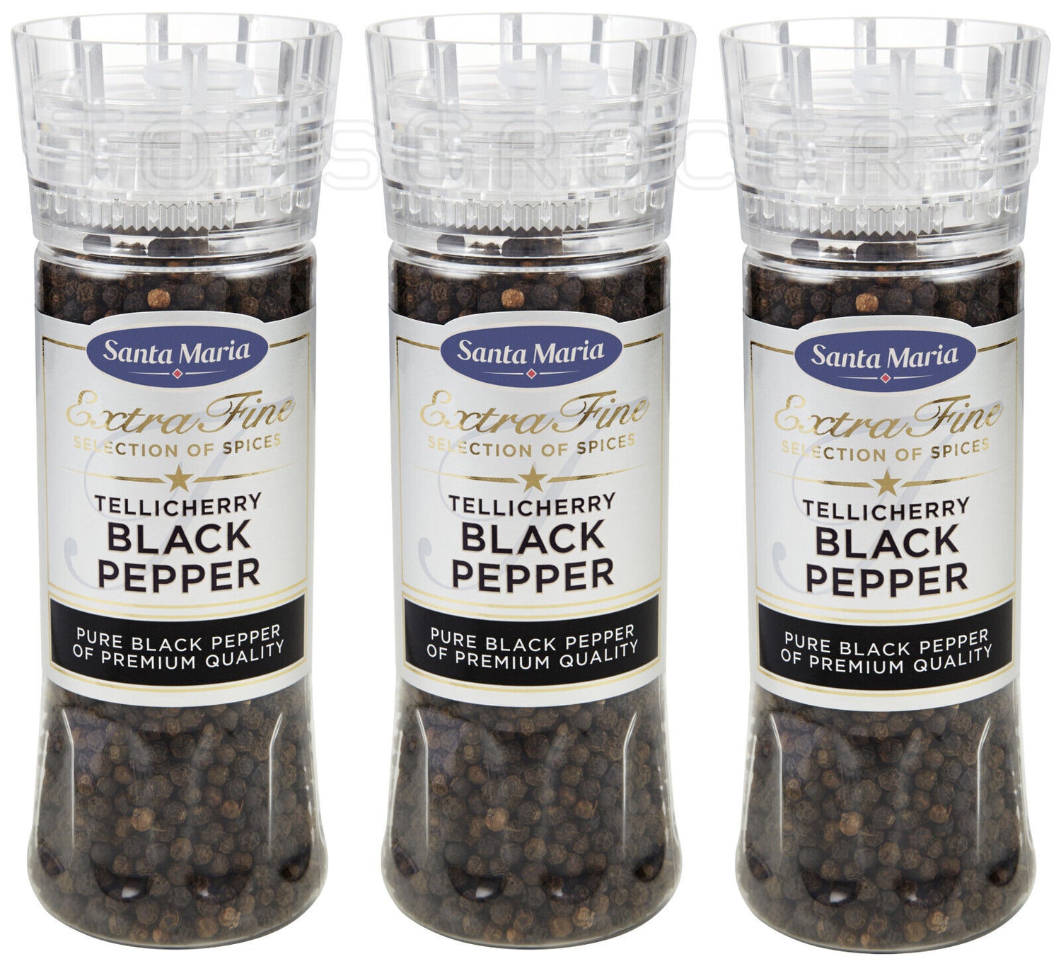 3 SANTA MARIA TELLICHERRY BLACK PEPPER Premium Quality XXL Grinders 210g 7.4oz