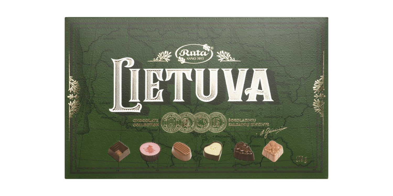 The set of chocolate candies "Lietuva" was created specifically to represent our country. In this set you will find 15 candies with the following fillings: mango and saffron, fragrant mandarin and white chocolate, caramel, beer flavor, Ruby chocolate and raspberry and crunchy hazelnut and rice chips.