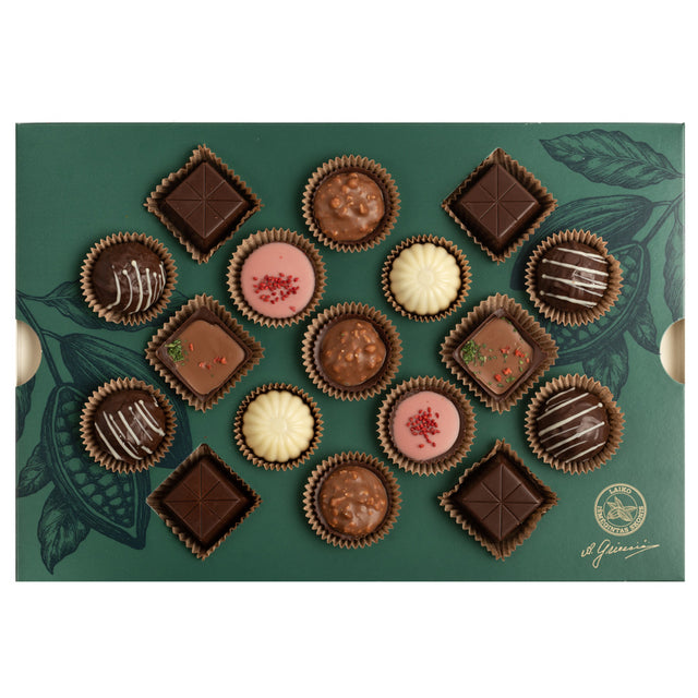 Ingredients: chocolate 31.5% (cocoa mass, sugar, cocoa butter, emulsifier SOY lecithin, natural vanilla flavouring), white chocolate filling (white chocolate 55% (sugar, whole MILK powder, cocoa butter, emulsifier SOY lecithin, natural vanilla flavouring), vegetable fats (palm, rapeseed), MILK fat), milk chocolate 14% (sugar, cocoa butter, whole MILK powder, cocoa mass, WHEY powder, MILK fat, emulsifiers (SOY lecithin, polyglycerol polyricinoleate), flavouring vanillin), white chocolate 9.1% (sugar, cocoa butter, whole MILK powder, emulsifier SOY lecithin, vanilla flavouring), sugar, vegetable fats (palm, palm kernels), glucose syrup, Ruby chocolate 2% (sugar, cocoa butter, whole MILK powder, cocoa mass, emulsifier SOY lecithin, acid (citric acid), natural vanilla flavouring), cocoa butter, kiwi puree (kiwi (90%), sugar), CASHEW NUTS (1.3%), HAZELNUTS (1.2%), whipped CREAM (CREAM (from MILK), MILK proteins, stabiliser carrageenan), skimmed MILK powder, Marsala wine filling 0.9% (Marsala wine (39%), sugar, EGG yolks, ethyl alcohol, condensed MILK, flavourings, modified starch), ALMONDS (1.4%), PECAN CURRY (0.6%), cocoa mass, mascarpone filling 0.4% (mascarpone CHEESE 50% (CREAM, whole MILK, acidity regulator citric acid), sugar, whole MILK, EGG yolks, ethyl alcohol, flavouring), WHEY powder, raspberries (0.3%), low-fat cocoa powder, brandy, rice crisps 0.2% (rice flour (87%), sugar, vegetable oil (rapeseed), salt, raising agent sodium bicarbonate), actinidia berries (0.2%), ethyl alcohol, passion fruit filling 0.1% (glucose syrup, passion fruit concentrate, sugar, lemon concentrate, water, natural flavouring, carrot concentrate, citrus fibre), BUTTER, strawberry granules 0.1% (glucose syrup, strawberries (40%), sugar, tapioca starch), strawberry filling 0.09% (glucose syrup, sugar, strawberry concentrate, water, lemon concentrate, carrot concentrate, safflower concentrate, natural flavouring, citrus fibre, elderberry concentrate), emulsifier SOY lecithin, coffee (0.07%), cranberry seeds, thickener pectin, flavourings, acidity regulator citric acid, dried spinach, iodised salt, peppermint oil. SOURCE OF FIBER. Cocoa solids in chocolate – not less than 55%. Cocoa solids in milk chocolate – not less than 32.1%, MILK solids – not less than 14.7%. Cocoa solids in Ruby chocolate – not less than 41.8%.