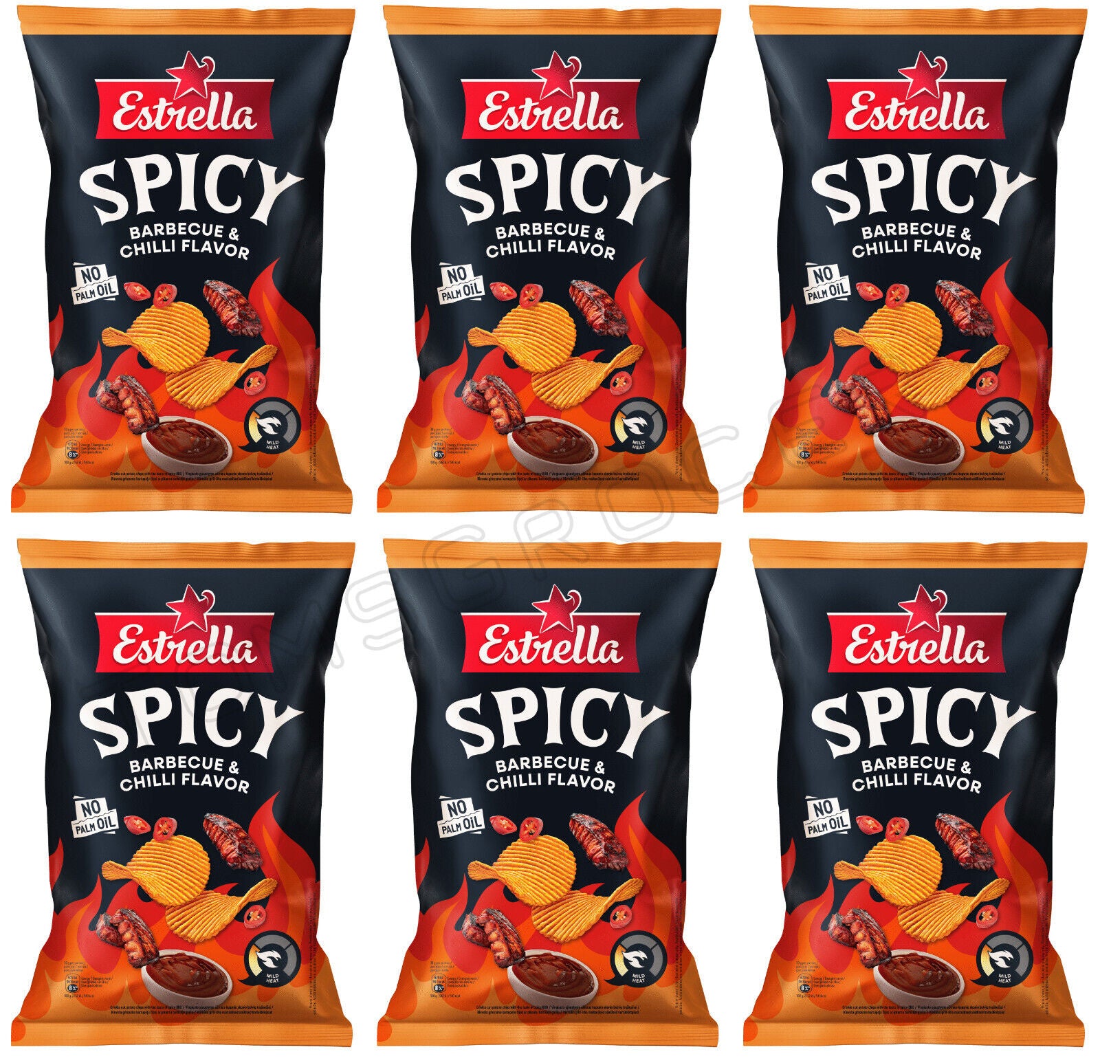 6 ESTRELLA SPICY Barbecue & Chilli Flavor Potato Chips Snacks Bags 115g 4oz